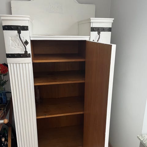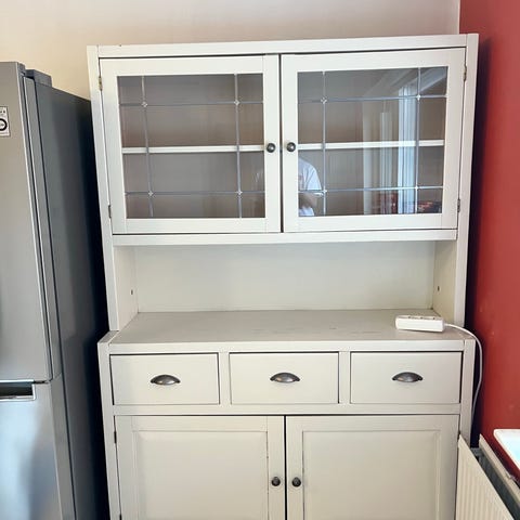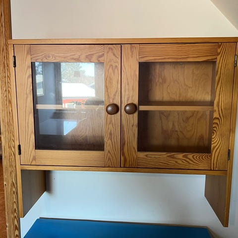 Skänker bort ett stabilt vitrinskåp med mycket förvaring. Finns inbyggd belysning, men den har vi inte använt. Märkte nu när vi ska skänka skåpet att bara en av två lampor verkar fungera i det, men som sagt går bra att använda ändå utan lamporna på eller kanske enkelt att fixa för den som vill/kan.