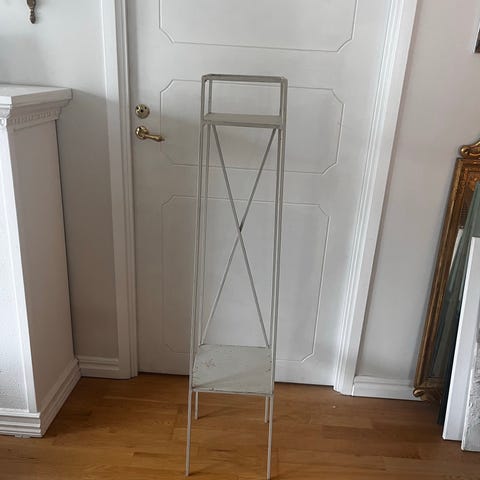 Blomkrukor och växtställ i trä i blandade storlekar och färger. Flera krukor i keramik och plast i olika former, både runda och fyrkantiga. Växtstället är i trä med tre hyllplan och vikbar konstruktion. Passar för placering av krukväxter inomhus eller på balkong/altan. Krukorna rymmer mindre till medelstora växter och kan användas för både prydnadsväxter och odling i kruka. Storlek på växtställen 92*20(översta hyllan), ca 52 nedre delen, höjd 89. Hämtas i Täby.