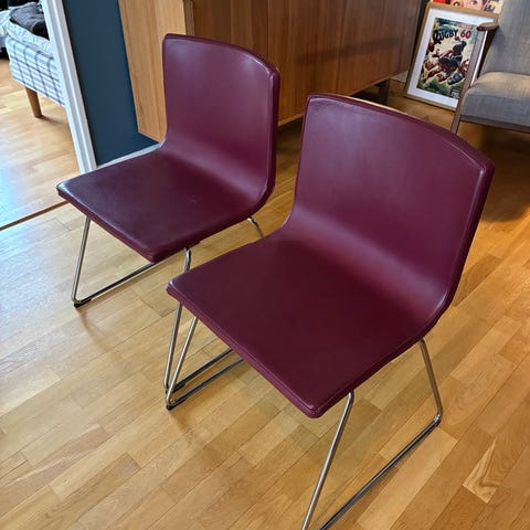 2 st stolar i bra skick. Ytan på den ena lite lite missfärgad pga märke efter sittdyna. Hämtas av köpare.