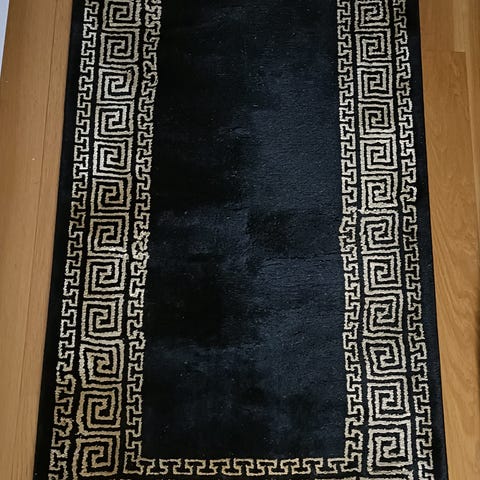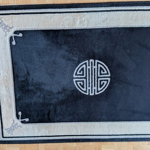Svart Kina-matta med beige dekor. Mått exkl.fransar