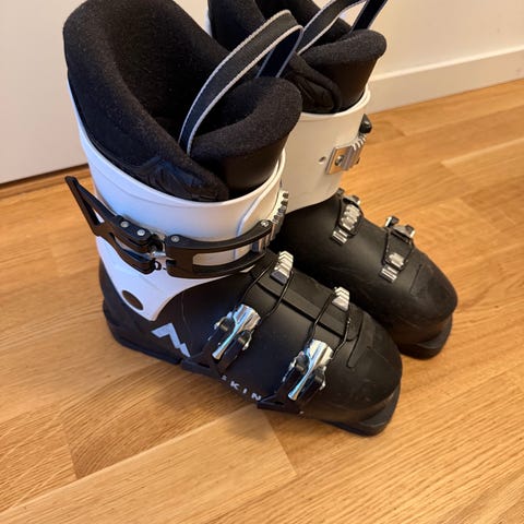 Slalompjäxor i storlek 235. Pjäxorna är svart/vita med flera spännen framtill för justering av passform. Avsedda för alpin skidåkning och kompatibla med vanliga alpina bindningar. Passar åkare som behöver en mindre pjäxstorlek runt 235 mm innersko.