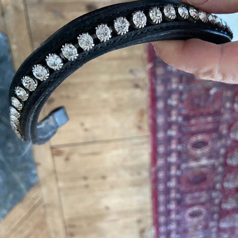 Ridspö i svart färg med dekorativt handtag med strassdetaljer. Lång, smal modell med greppvänligt handtag. All around. Oanvänt. Finns i Jakobsberg.