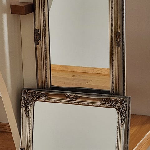 Säljer tre speglar med dekorativ guldram, en vit. Rektangulär helkroppsmodell som kan ställas mot vägg eller hängas upp vertikalt.