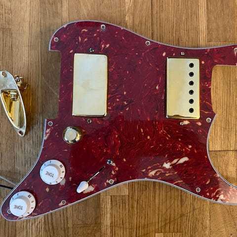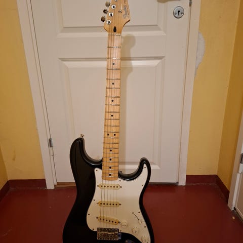 Ett laddat plektrumskydd från en Fender Stratocaster Elite. Mickarna är fjärde generationen av Fenders noiseless. Man kan växla till så kallad S1 switching via tryckknapp på volymkontrollen. Tonkontroll har no load funktion där den blir i bypass läge. Många funktioner att använda om man vill, eller bara köra som ett vanligt Strata set.