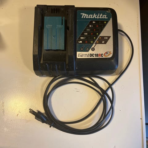Makita DC18RC batteriladdare för Makita uppladdningsbara batterier. Laddaren är nätansluten med tvåpolig kontakt och har indikatorlampor på ovansidan som visar laddningsstatus och felmeddelanden. Avsedd för laddning av kompatibla Makita-batterier enligt märkning på enhetens undersida. Passar för användning i verkstad, garage eller på byggarbetsplats där Makita-verktyg används.