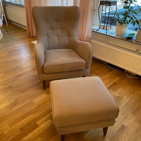 Strandmon fåtölj med tillhörande pall i mörkgrått tyg. Fåtöljen och pallen är i bra skick, varsamt använda. Köptes nya 2022. Finns att hämta i centrala Göteborg.