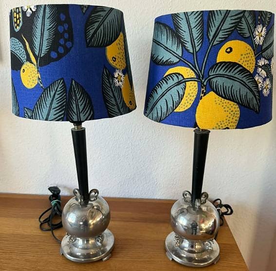 En Art Deco golvlampa i svart och krom. Nydragen el, ny sladd. Nytillverkad skärm i SVENSKT TENNS TYG SVART ELEFANT, ESTRID ERICSON.