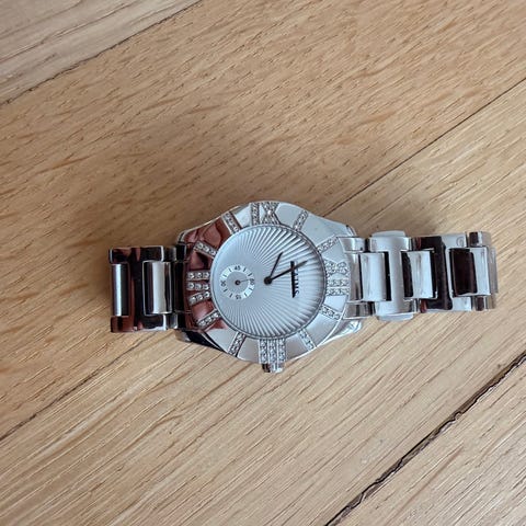 TAJMS damklocka i guldfärg. Klockan har en urtavla med pärlemor-effekt och strassdetaljer runt boetten och på urtavlan. Armbandet är i guldfärgad metall.