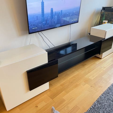 Säljer en stilren och modern TV-bänk i vitt med elegant svart toppskiva – perfekt för dig som vill ha en minimalistisk och tidlös möbel i vardagsrummet.