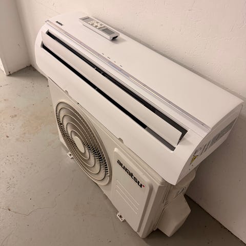 Gree GWH12ACC-S6DBA1 luftkonditionering i vit färg. Systemet använder köldmediet R32 och har anslutningsrör 1/4" och 3/8". Inomhus- och utomhusdel ingår enligt bilderna. Enheten är avsedd för kylning och uppvärmning av inomhusluft i bostäder eller liknande utrymmen, med energieffektivitetsklass A+ enligt märkningen på förpackningen.