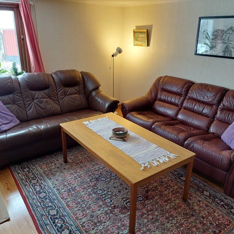 Bekväm och helt ok i dynor och stomme. Klädsel nopprig och rivmärken av katt. Med ny klädsel funkar den fint.