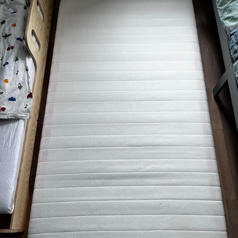 IKEA Vestmarka 90x200x18 i vit färg. Rektangulär modell med quiltad ovansida. Passar till säng eller gästsäng beroende på mått. Ytan är slät med sydda kanaler. Madrassen har tygklädsel med ljus ovansida och ljusgrå kant. Lämplig för användning i hemmet, exempelvis i sovrum eller gästrum.