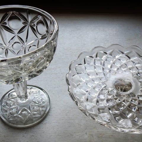 Runda glasfat med dekorativa pressade mönster. Ett fat i ljust bärnstensfärgat glas och ett fat i klart glas. Passar till servering av kakor, frukt eller andra tillbehör. Tillverkade i glas med strukturerad yta och ornamenterade kanter respektive stjärnformade mönster.