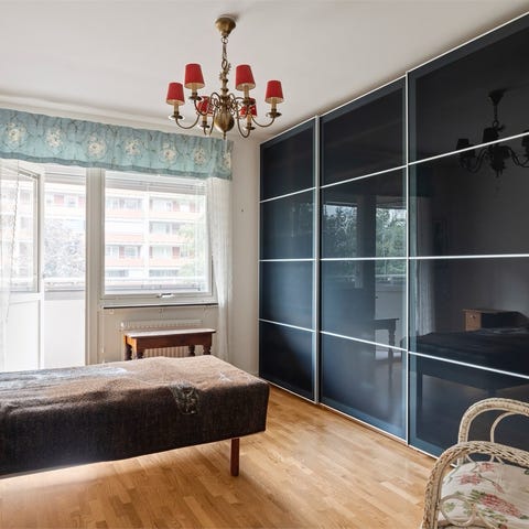 IKEA PAX skjutdörrar i svart stomme och infällda partier av mörkt frostat glas. Skjutdörrarna löper i skenor upptill och nedtill och täcker hela garderobsfronten. Passar som förvaringslösning i sovrum, hall eller klädkammare.