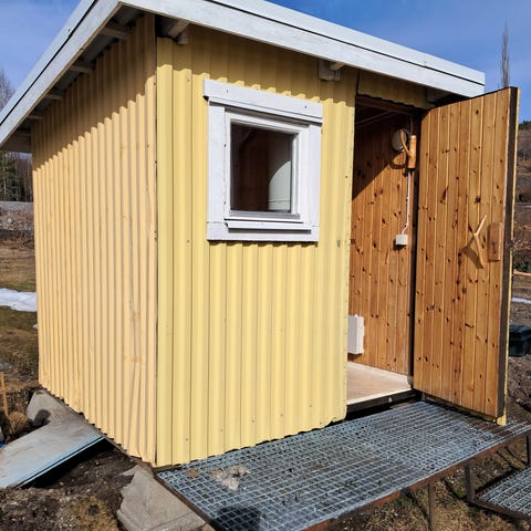 Golv och isolering är delvis bytt efter att fukt kommit in. Den är nu torr, men behöver ny plastmatta. Duschen är utplockad, men delarna finns. Renovering som påbörjats, men inte avslutats.