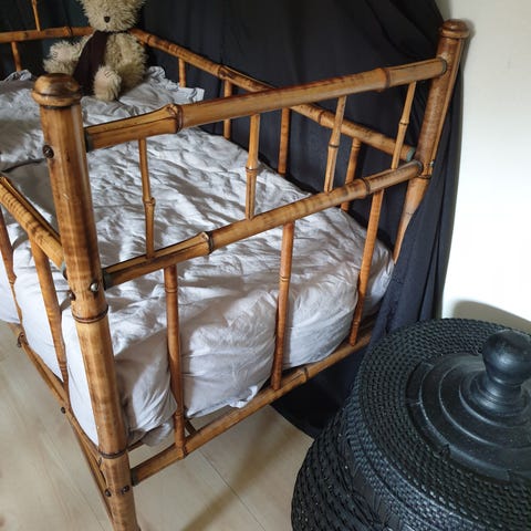 Världens finaste spjälsäng. Kan justeras i två olika höjder. Väldigt fint skick, men finns några skav men inte av så stor betydelse. En unik spjälsäng! Man kan också ta bort spjälorna.