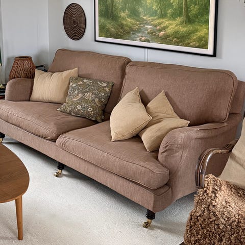 Mycket lite använd i fint skick inga fläckar eller skador. Ej hund eller katt i hemmet. Mått ca bredd 2,4 m djup 1,20, sitthöjd 45 cm.