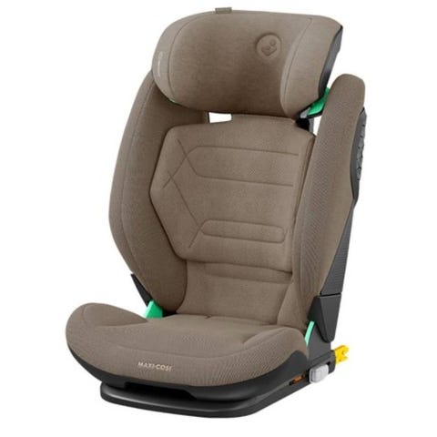 Bilbarnstolen är i en beige färg med svart bas. Sits och rygg är vadderade för ökad komfort och sidostöden ger extra stöd. Stolen har hög rygg och huvudstöd som omsluter barnet. Isofix montering.