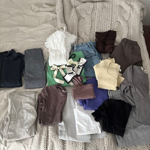 Xs/34 i samtliga förutom beigea ”linnebyxorna” som är i storlek S