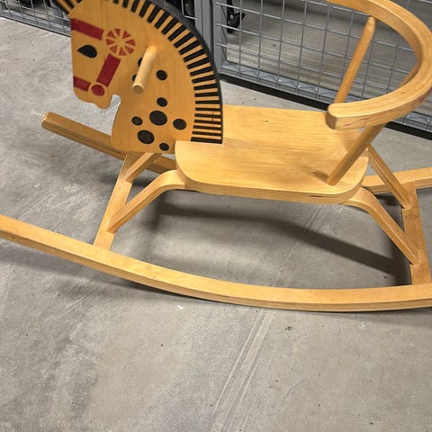 Gungstol i trä för barn. Stolen har en design som liknar en häst med målade detaljer på huvudet. Den är tillverkad av ljust trä och har en stabil konstruktion.