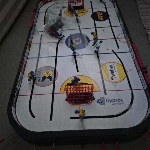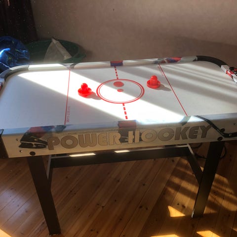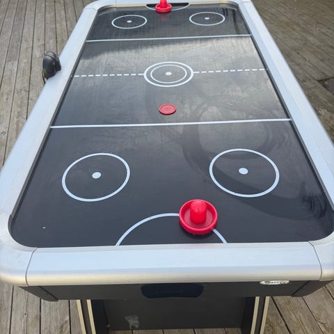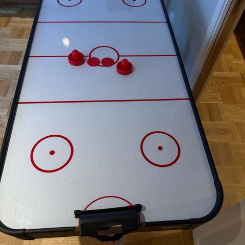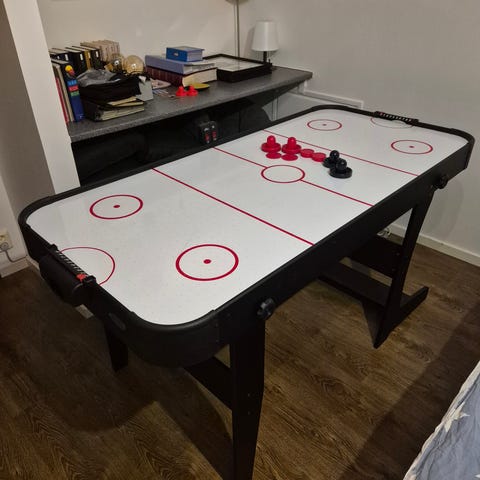 Airhockeybord på ben som kan fällas ihop för smidigare förvaring. Tre puckar och fyra handtag eller pushers.