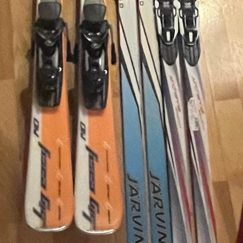 Edsbyn Snow Jr längdskidor med tillhörande stavar. Skidorna är 120 cm långa och har en design i svart, vitt, rött och blått med snöflingemotiv. Utrustade med rembindningar som passar vanliga vinterkängor eller stövlar. Undersidan har fiskfjällmönster för fäste i spår. Stavarna är svarta med enkla handtag och trugor. Lämpliga för barn som vill åka längdskidor i preparerade spår eller på planare underlag.