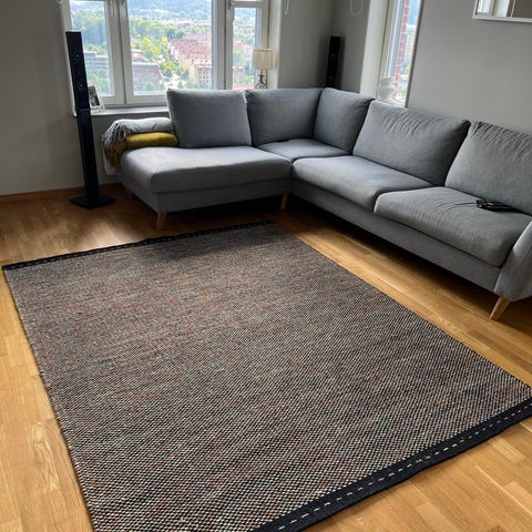 Ullmatta, mörkgrå med läderkant.