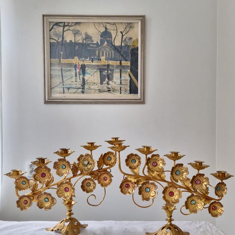 ca. 60 cm hög fransk ljusstake, synligt använd, kan behöva lite kärlek
