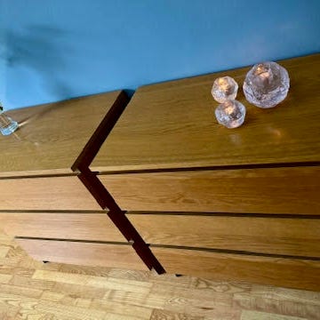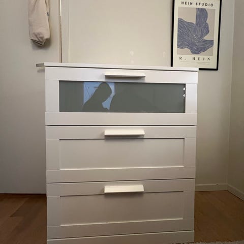 IKEA byrå med tre lådor i blå färg. Översta lådan har en front med frostat glas och de två nedre lådorna har släta fronter.