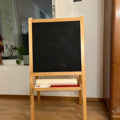 Har fått bort det mesta klottret, syns att den är använd. Ev medflöjer några whiteboardpennor beroende på vad som hittas annars finns det och köpa på ikea.