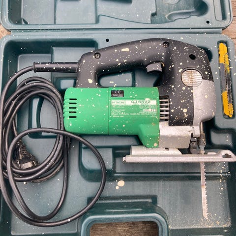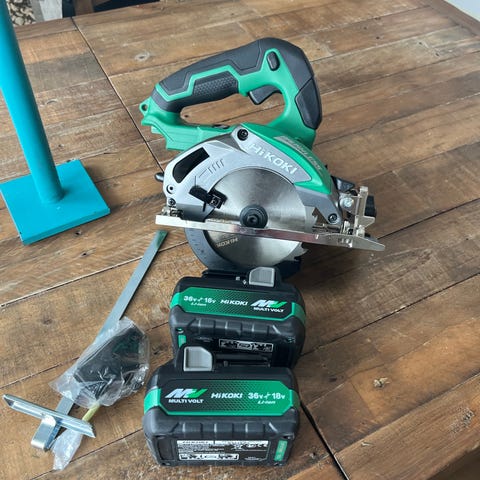 Hitachi cirkelsåg med grön handtag och skyddskåpa. Levereras i hård plastväska för förvaring och transport. Lämplig för kapning och klyvning av trä och liknande material i hem- och byggprojekt.