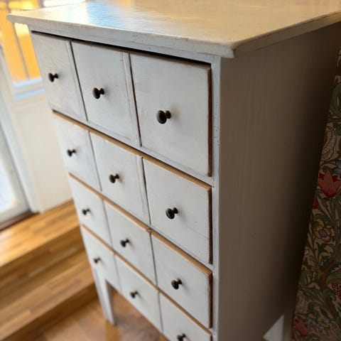 Byrån har en liten skada mellan dom två nedersta lådorna. Se sista bilden.