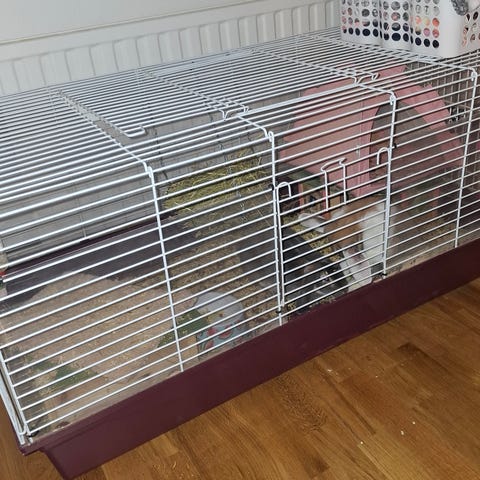 Stor smådjursbur för kanin eller marsvin från GD easy. Två öppningar upptill och två framtill. Mörkblå plastbotten och grått galler. Mått ca 135 × 66 × 60,5cm. Fint skick, lite missfärgningar i botten som det blir när buren har används. Nypris var runt 2000kr.