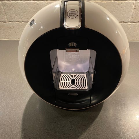 Dolce Gusto kapselmaskin i vit färg. Maskinen är avsedd för kaffekapslar från Dolce Gusto-systemet och kan användas för att brygga olika typer av varma drycker beroende på kapseltyp, till exempel kaffe, espresso och choklad. Utrustad med droppgaller och vattenbehållare på baksidan. Passar för användning i kök, kontor eller andra miljöer där man vill göra enstaka koppar kaffe med kapslar.