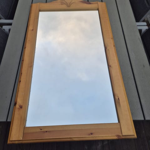 Åke Fribyter väggspegel i ek från slutet av 1950 talet , tillverkad hos Glas & Trä i Hovmantorp. Mått: 95x66cm.