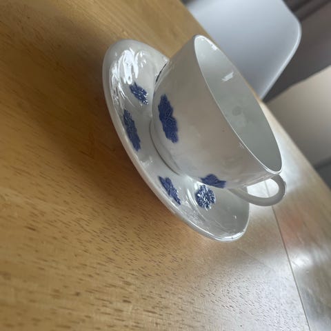 Säljer denna så himla fina med gammeldags mönster på Te koppen. Den är inhandlad på Zara home. Och Temuggen är Ny. Mvh Marita Mikkola