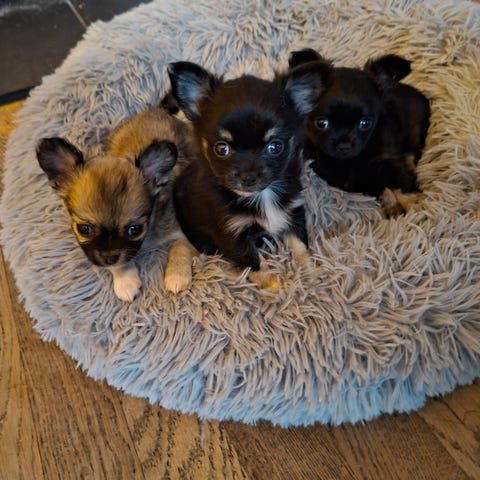 Den 16/1-2026 föddes tre små mirakel här hemma hos oss, och nu har de hunnit bli 5 veckor gamla. Deras personligheter har verkligen börjat blomma ut, och det är tre helt underbara små individer. Valparna växer upp mitt i vårt hem med mycket närhet, kärlek, vardagsljud och socialisering. De är vana vid liv och rörelse och får dagligen massor av gos, lek och trygghet, en fin start på livet som vi hoppas ska fortsätta i deras framtida familjer.