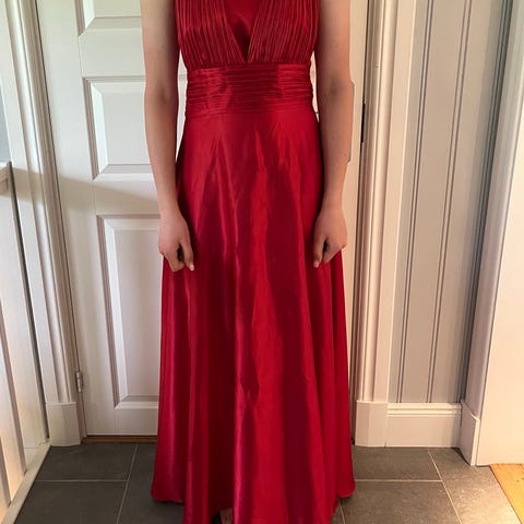 Säljer en elegant strapless lång festklänning i vinröd färg. Klänningen har en glittrig paljettöverdel och en lång kjol med fin drapering/slits framtill, vilket gör den perfekt till bal, gala, fest eller nyår.