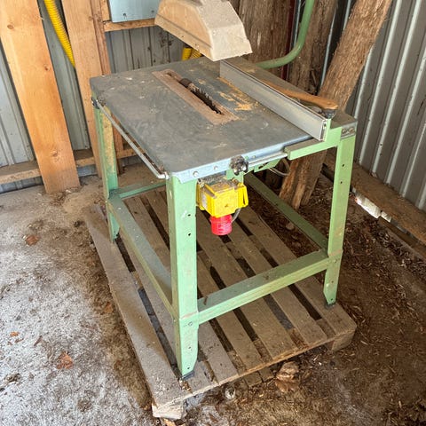 Bordcirkelsåg monterad på kraftig träställning. Sågen har fast bord med cirkelsågblad upp genom bordsskivan samt remdrift med motor monterad under bordet. Konstruktionen är robust och lämpar sig för kapning och klyvning av virke och andra trädetaljer i verkstad eller hobbybruk. Bordet har öppningsbar del för åtkomst till sågblad och drivning.