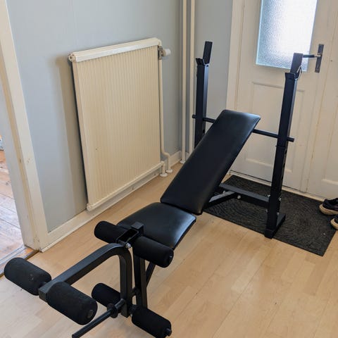 Träningsbänk med skivstångsställning. Köpt på biltema för 1199kr. Säljes för 600kr. Inga vikter eller stång medföljer