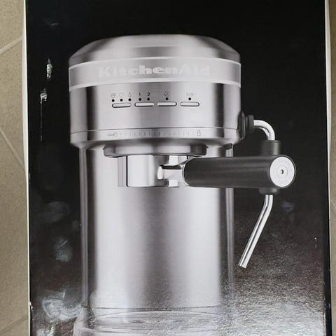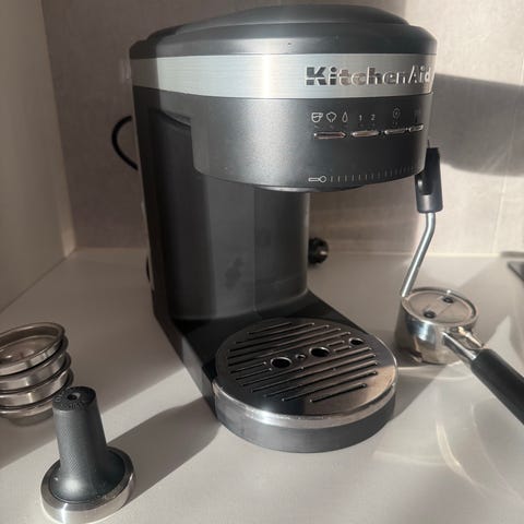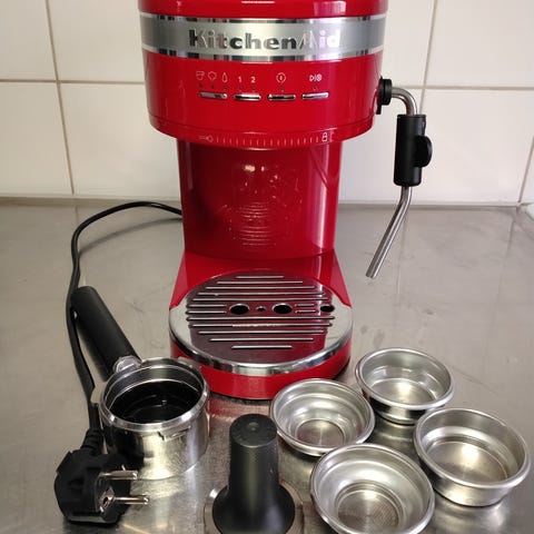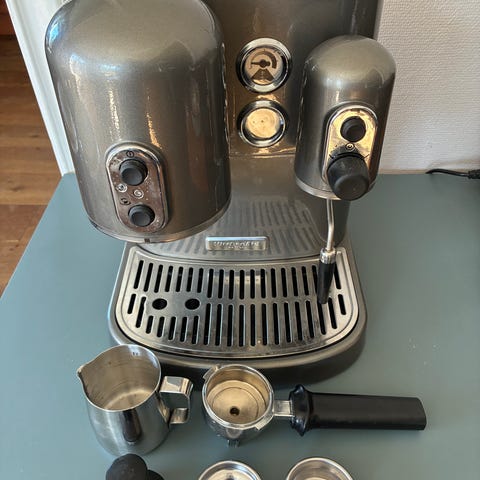 KitchenAid espressomaskin i rostfritt stål. Maskinen har avtagbar vattentank och droppbricka med galler. Tillbehör som portafilter, flera filterkorgar, tamper, mjölkkanna i metall och måttskopa medföljer enligt bilder. Lämplig för bryggning av espresso och mjölkbaserade kaffedrycker i hemmet.