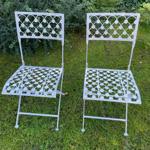 2 st stolar för utomhusbruk i grå gjuten aluminium. Sits och rygg har ett rutmönstrat, genombrutet utförande som gör att vatten lätt rinner av. Passar som trädgårdsstol eller caféstol på altan, uteplats eller balkong. Kan kombineras med olika typer av utomhusbord.