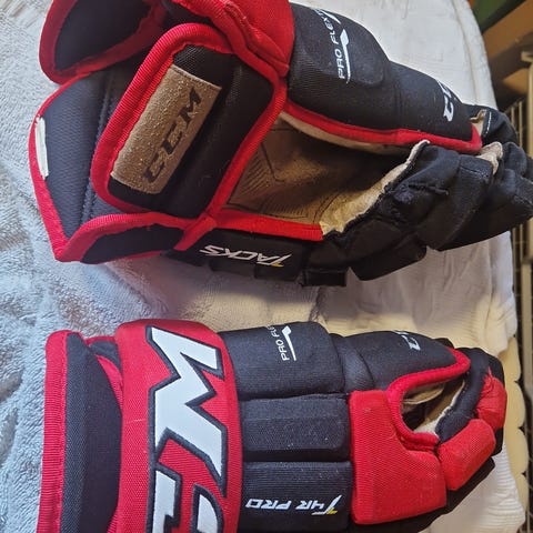 Reebok 4K hockeyhandskar i storlek 14 tum (36 cm). Handskarna är svarta med vita detaljer och har grön insida.