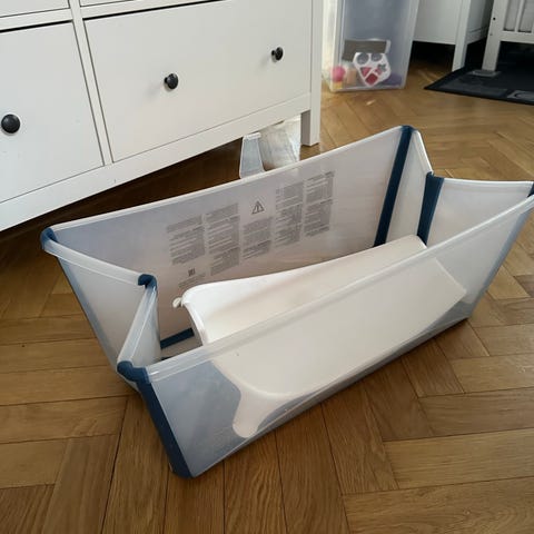 Säljer Stokkes klassiska hopfällbara badbalja med badstöd som underlättar säker badning för bäbisar. Supersmidigt att kunna fälla ihop och ställa undan om man tex bor i lägenhet! Fint skick.