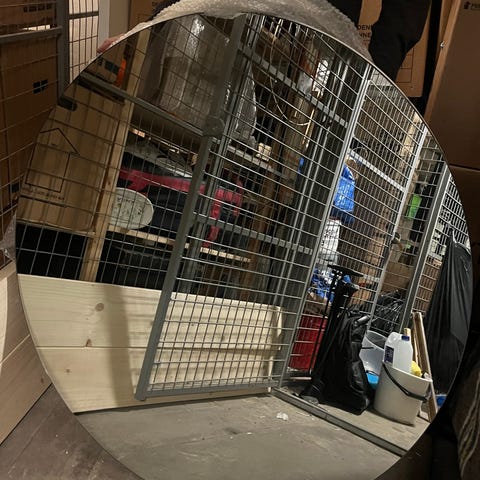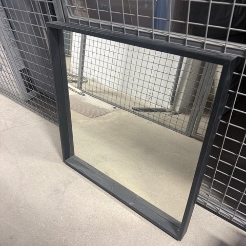 Rusta rund spegel med svart ram. Spegeln har en tunn metallram runt kanten och baksida med upphängningsfäste.