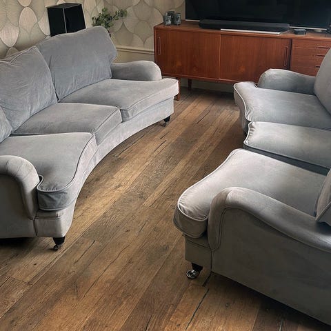 Medföljer skräddarsydda armstödsskydd som jag sydde upp med exakt samma tyg. De är avtagbara och enkla att tvätta samt ser till att hålla soffan i gott skick.