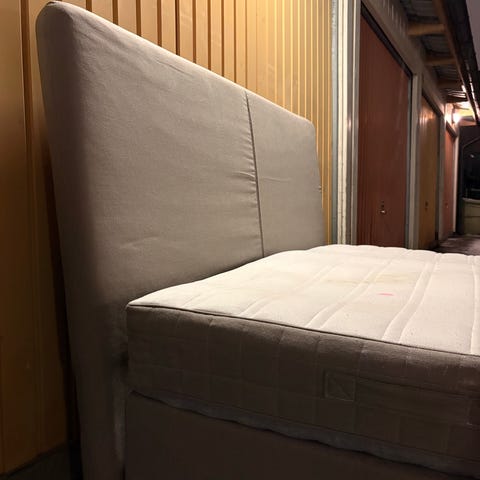 Använd i cirka 3 år. Stabil stomme, bekväm madrass och sänggavel ingår.