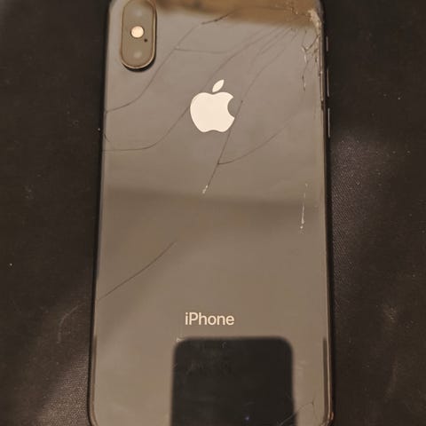 Apple iPhone X smartphone i svart färg. Modellen har pekskärm och dubbla kameror på baksidan. Mobilen har sprickor i skärmen och märken på frontglaset. Baksidan är i glas med Apple-logotyp och kameramodul upptill vänster. Fungerar jätte bra och smidigt fortfarande.
