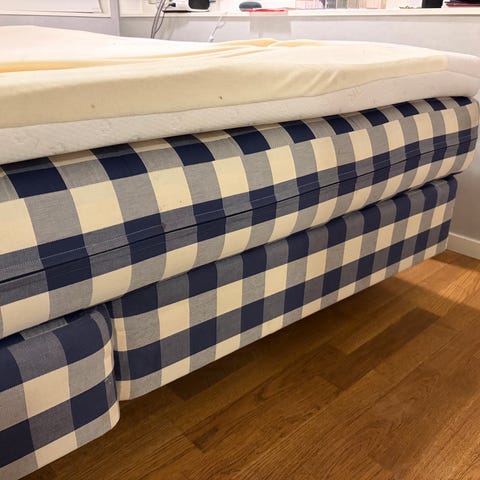 Hästens bäddmadrass i beige rutmönstrat tyg.
