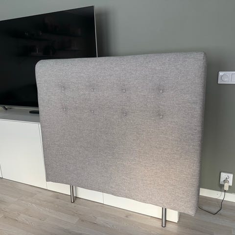 IKEA RYKKINN sänggavel i beige tyg, bredd 120 cm. Sänggaveln har vadderad, rutquiltad framsida och är avsedd att placeras bakom en säng med motsvarande bredd. Höjd och djup enligt originalmått från IKEA, med ben för montering mot säng eller vägg enligt anvisning. Passar som ryggstöd vid läsning eller sittande i sängen och ger en textil avslutning mot väggen bakom sängen.